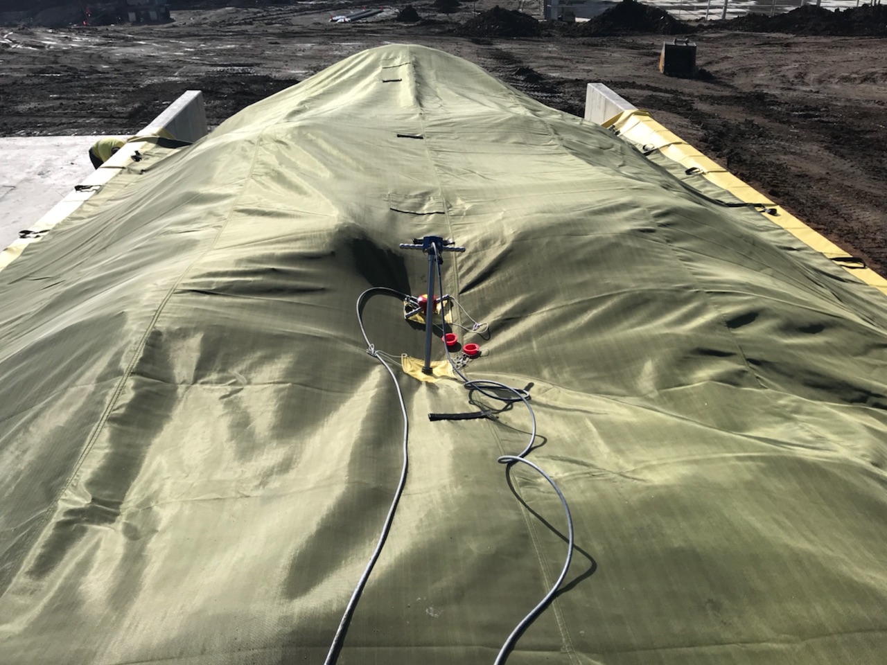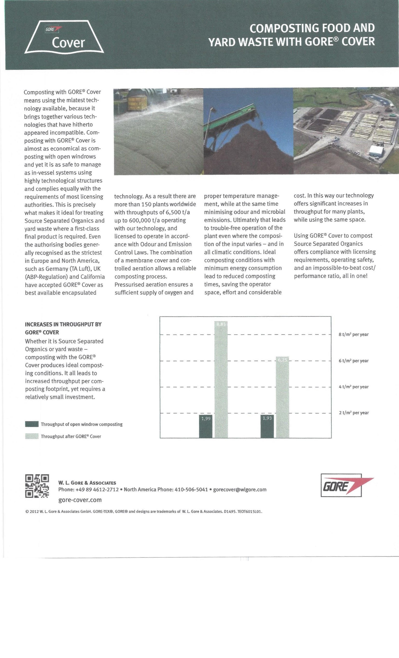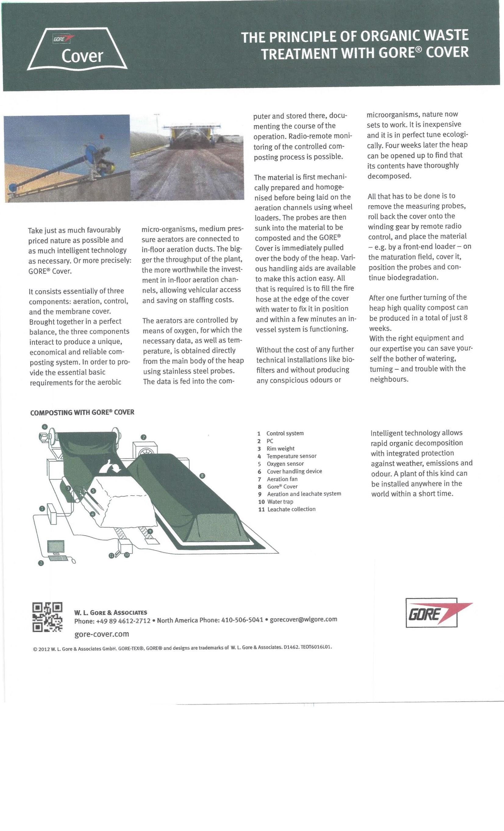 W.L. Gore & Associate’s GORE® Cover is based on membrane laminate technology similar to that of its GORE-TEX® fabrics. The integrated system includes the GORE® Cover, in-floor aeration, aeration blowers, oxygen and temperature sensors, controllers, computers, software, cover handling systems, training, engineering guidance, and installation support. Official approvals have been granted to the GORE®Cover as being “in-vessel” approved in several countries, meeting strict PFRP and high quality compost standards, obtaining Animal by Product Approval as well as meeting strict regulatory compliance standards worldwide. In the United States, according to the EPA, for biosolids,the GORE®Cover model is currently categorized as covered aerated static pile.